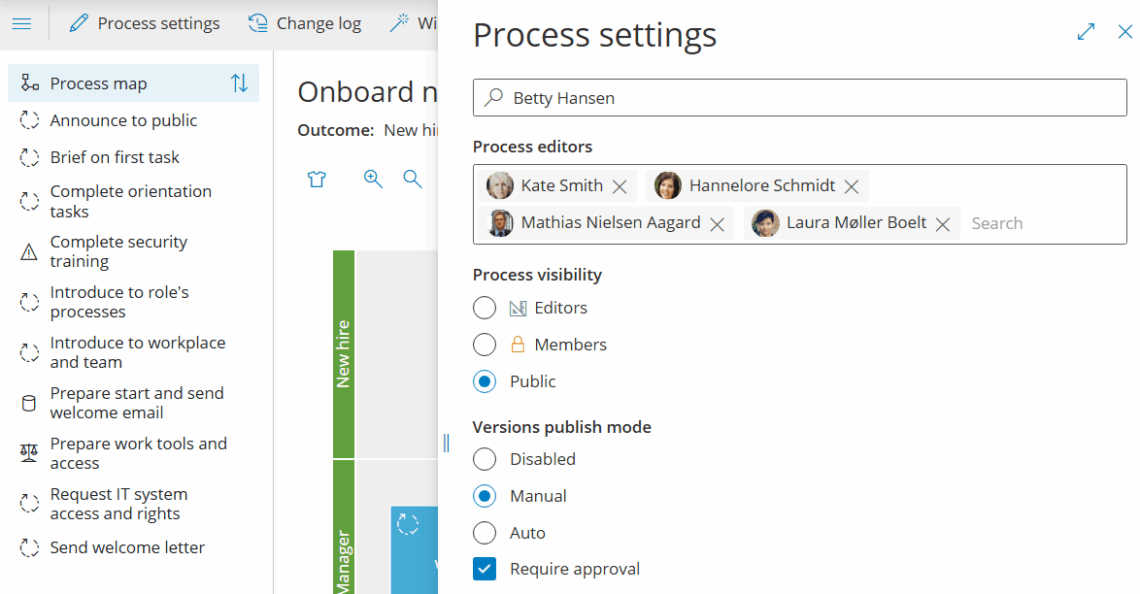 Godkendelser hjælper med at sikre, at en ny procesversion gennemgås, før den udgives til brugerne. Hver proces kan indstilles til at kræve godkendelse eller ej. Du kan også håndhæve kontoovergribende godkendere (f.eks. kvalitetschef) på tværs af flere processer. En proces kan have tre indstillinger for versionsstyring og godkendelse: