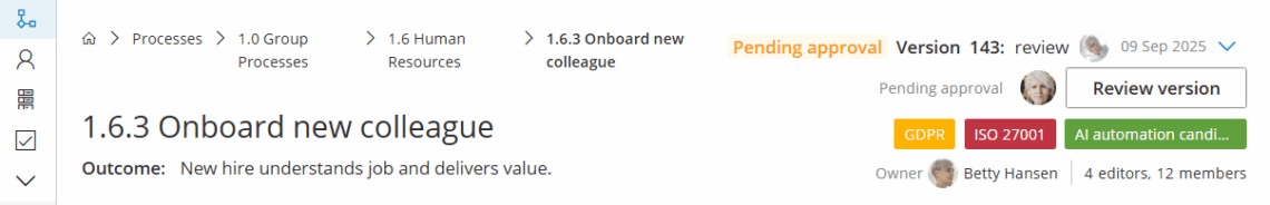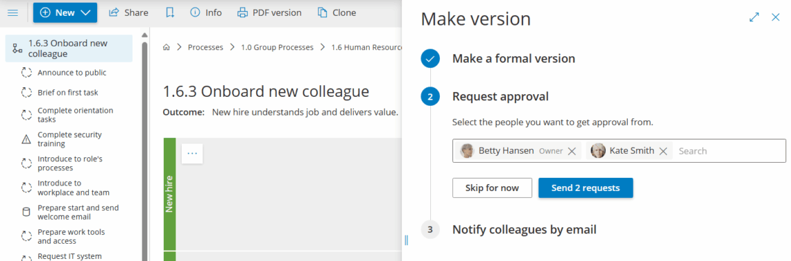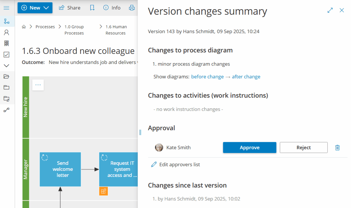 Mål: Anmod om, spor og fuldfør godkendelser for en ny procesversion – så ændringer først træder i kraft, når de rette personer har gennemgået dem.