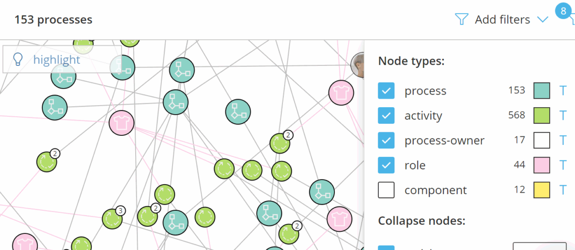 Hvis du vil vide, hvordan processer er forbundet, hvor komponenter bruges, eller hvor en aktivitet vises i flere processer, giver Gluu Explorer dig det overblik. Du finder Explorer i menuen til venstre under ‘Processer’.
