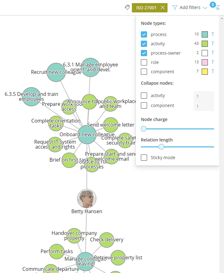 Du kan også filtrere efter etiket for at se, hvor den bruges. Dette hjælper med at vise, for eksempel, hvilke procesejere der er ansvarlige for ISO-mærkede processer.