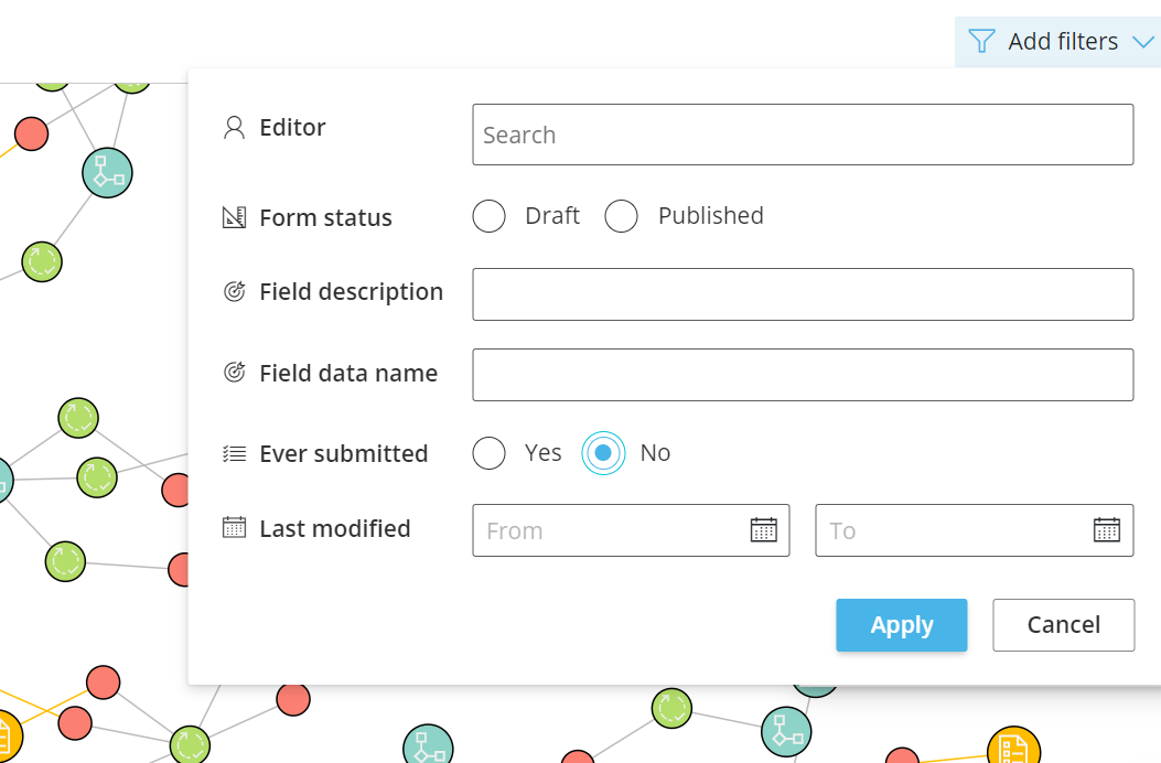 Du kan filtrere efter formularfelter eller efter formularredaktør for at fokusere visningen.