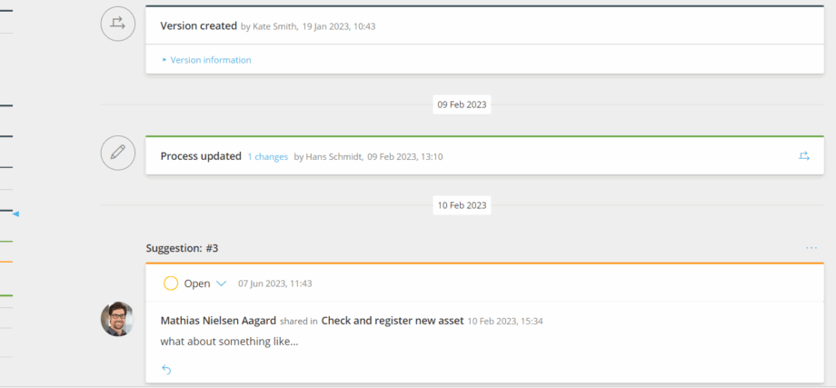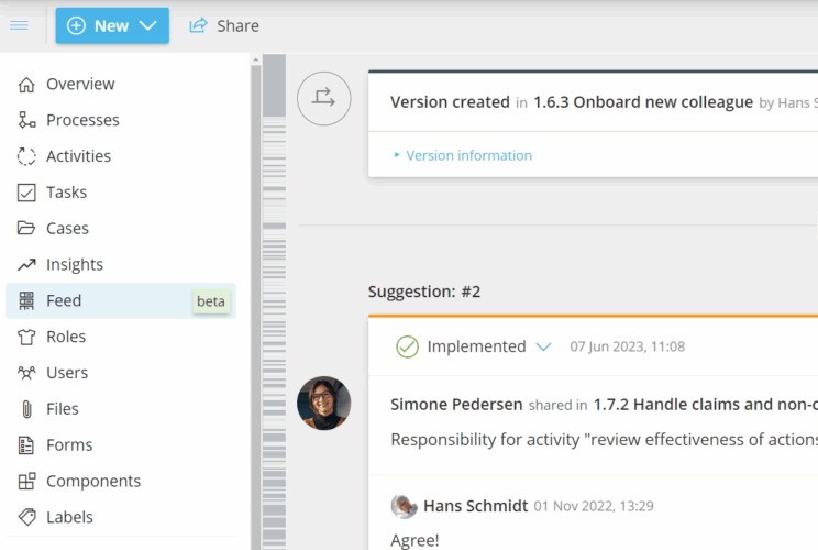 Procesfeedet viser versioner, kommentarer, procesændringer og ændringsforslag for den specifikke proces, du ser.