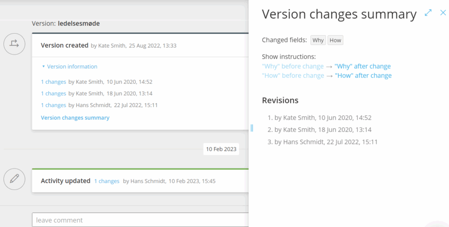 - Gennemgå processens versioner, kommentarer, ændringer og forslag.