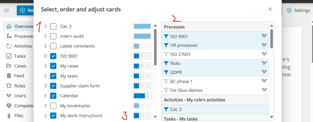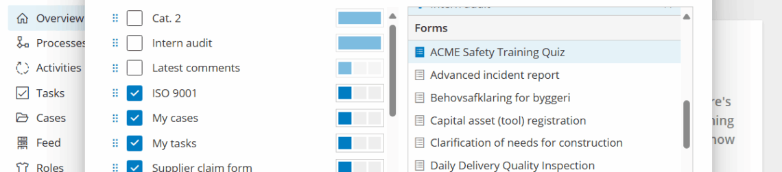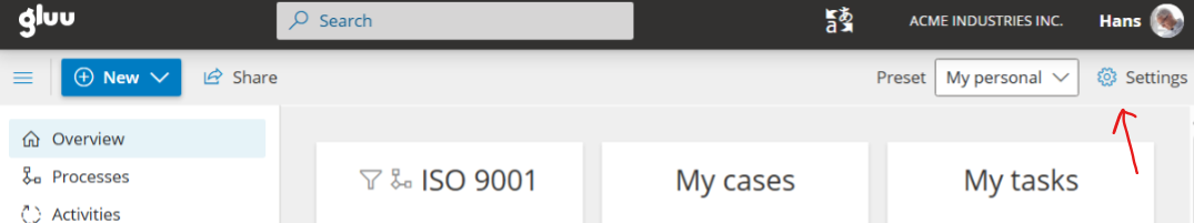 - Öffnen Sie die Seite mit dem gewünschten Inhalt (Prozesse, Aktivitäten, Aufgaben, Fälle).
