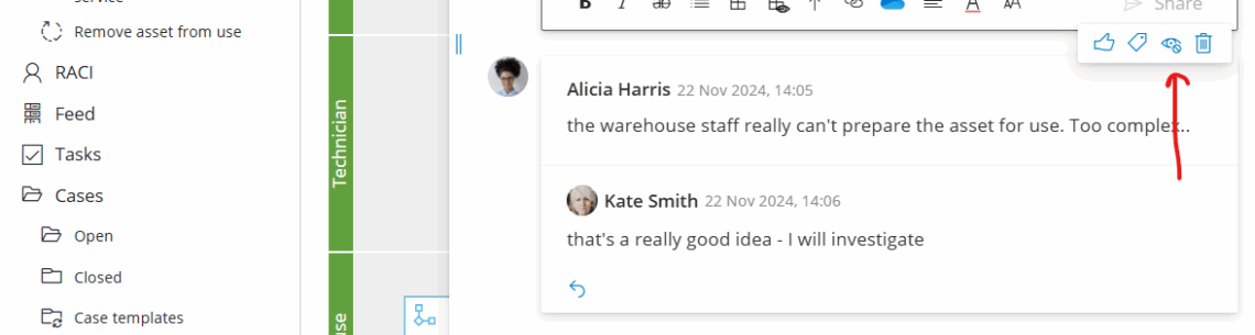 - Klicken Sie auf eine beliebige Aktivität in einem Prozess. Dadurch öffnen sich Optionen zum Kommentieren.