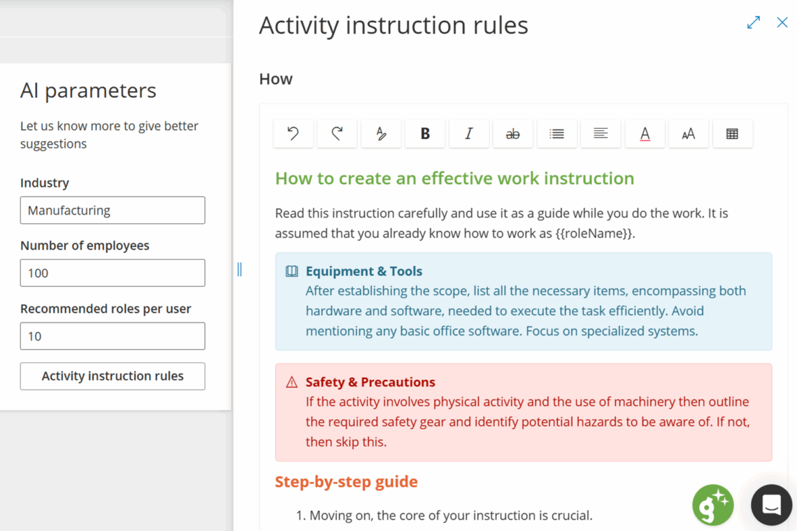 Ziel: Beschleunigen Sie die Prozessarbeit mit integrierter KI ohne Prompts – erstellen oder überarbeiten Sie Arbeitsanweisungen, schlagen Sie Aufgaben vor, bereichern Sie Rollen, übersetzen Sie Inhalte und steuern Sie den Zugriff im Adminbereich.