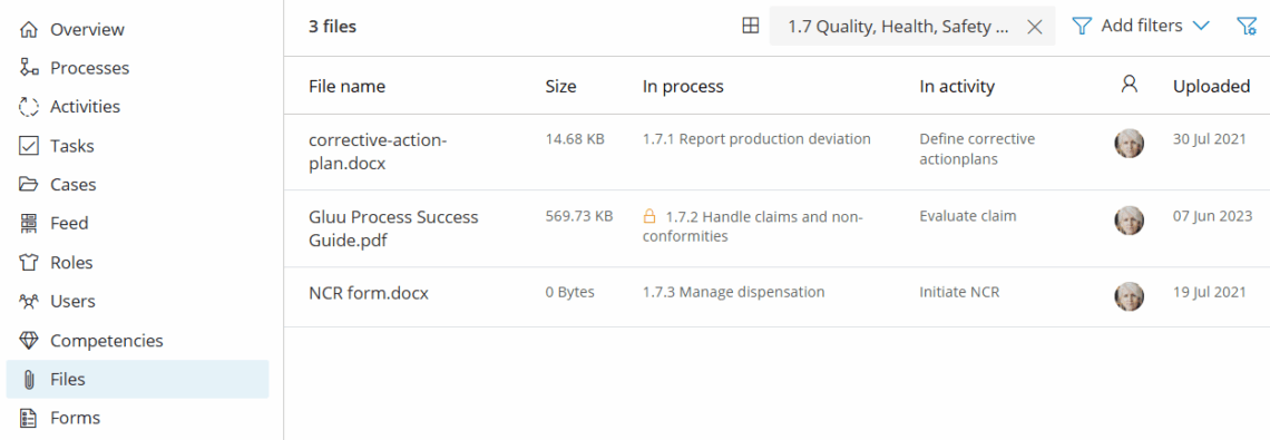 Die Gluu-Dateiverwaltung ist einfach und grundlegend konzipiert. Für eine erweiterte Dateiverwaltung empfehlen wir Tools wie SharePoint, die in Gluu integriert sind. Dieser Artikel behandelt das Anzeigen von Dateien und das Verwalten von Duplikaten. Wenn Sie neue Dateien hinzufügen müssen, lesen Sie Eine Arbeitsanweisung erstellen.