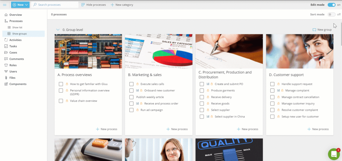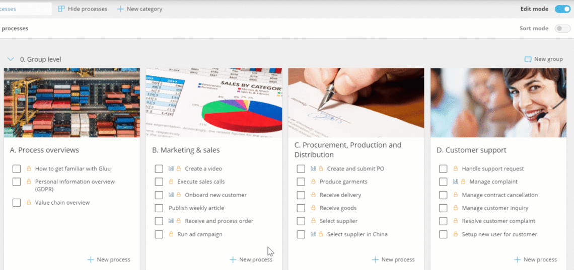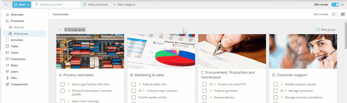 - Gruppen, um kleinere Gruppen von Prozessen innerhalb von Kategorien zu erstellen.