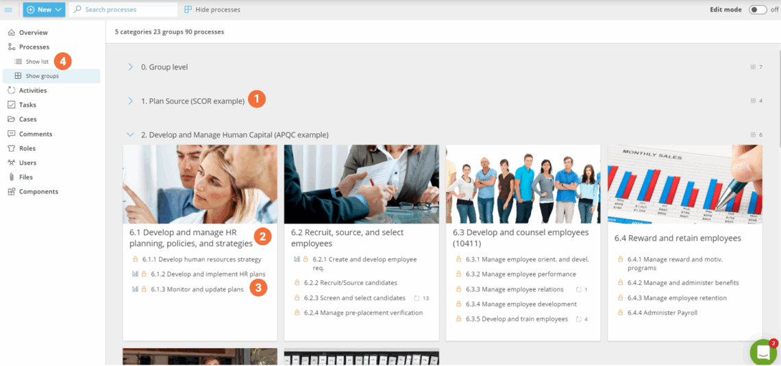 Kategorien, Gruppen und Prozesse werden numerisch und alphabetisch sortiert. Fügen Sie Zahlen hinzu, wenn Sie eine bestimmte Reihenfolge wünschen, oder verlassen Sie sich auf die automatische alphabetische Sortierung.