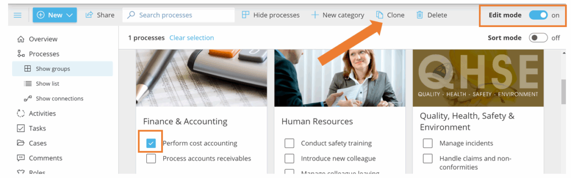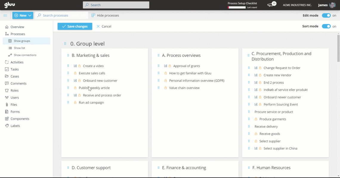 Ziel: Verwenden Sie eine Prozesshierarchie, um Prozesse zu organisieren mit Kategorien, Gruppen und Prozessen – und klonen, verschieben, sortieren und bearbeiten Sie sie dann in großen Mengen, um alles konsistent zu halten.