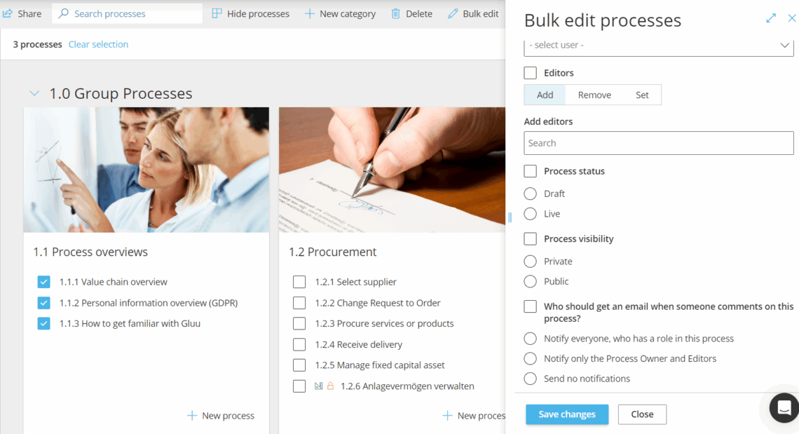 - Aktualisieren Sie Eigentümer, Editoren, Prozessstatus, Prozesssichtbarkeit oder Benachrichtigungen.