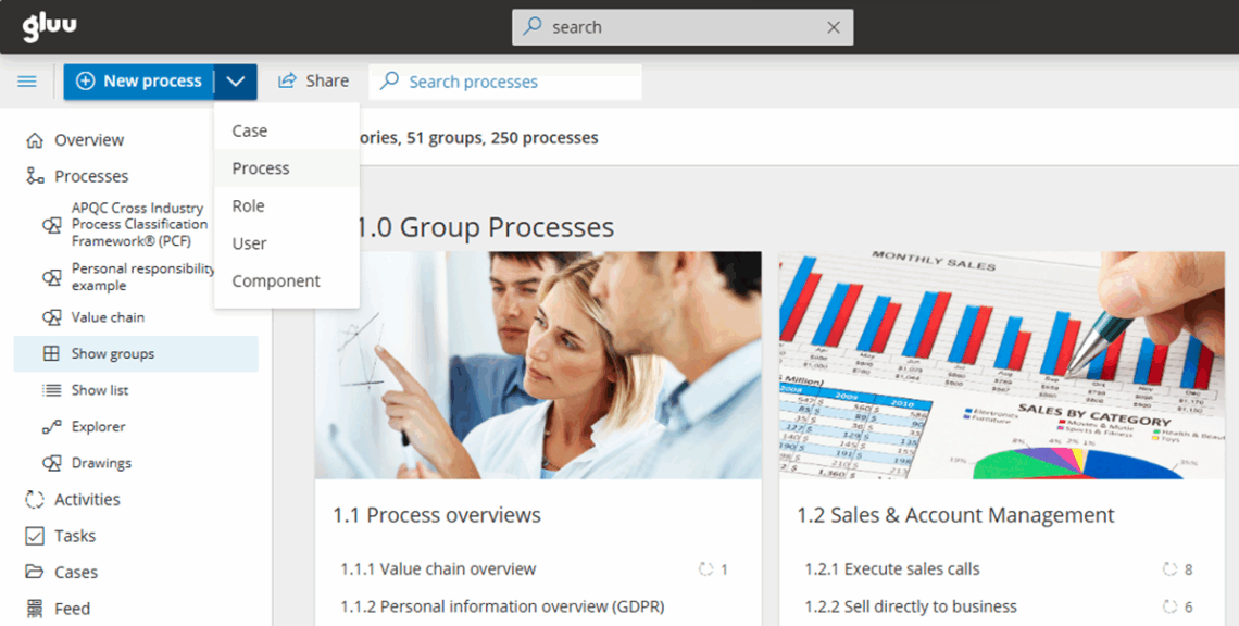 Wer dies tun kann: Benutzer mit Berechtigungen zum Verwalten von Prozessen können Prozesse in der Hierarchie erstellen (Schritt 1). Prozessverantwortliche und Editoren können bestimmte Prozesse bearbeiten (ab Schritt 2).