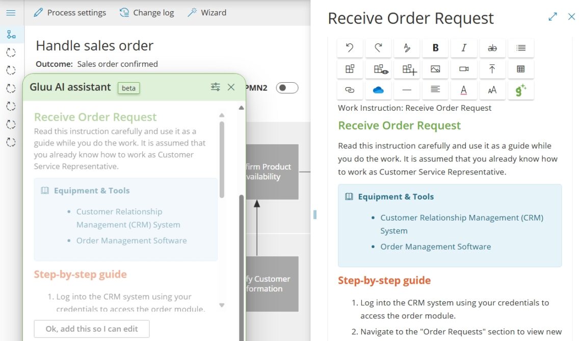 - Umschreiben und anreichern — Fügen Sie Notizen und Grafiken hinzu, klicken Sie auf das Gluu-Assistenten-Symbol und wählen Sie dann „Anweisungstext umschreiben“.