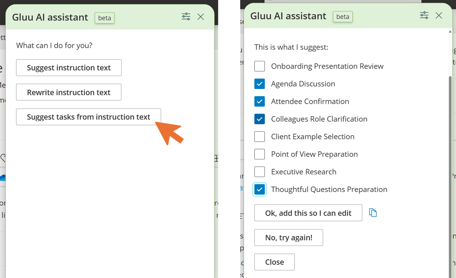 Öffnen Sie in der Aktivität Arbeitsanweisungen und verwenden Sie den Gluu KI-Assistenten (Aufgaben vorschlagen…), um Kandidaten zu generieren. Fügen Sie bei Bedarf Aufgaben hinzu oder bearbeiten Sie sie.
