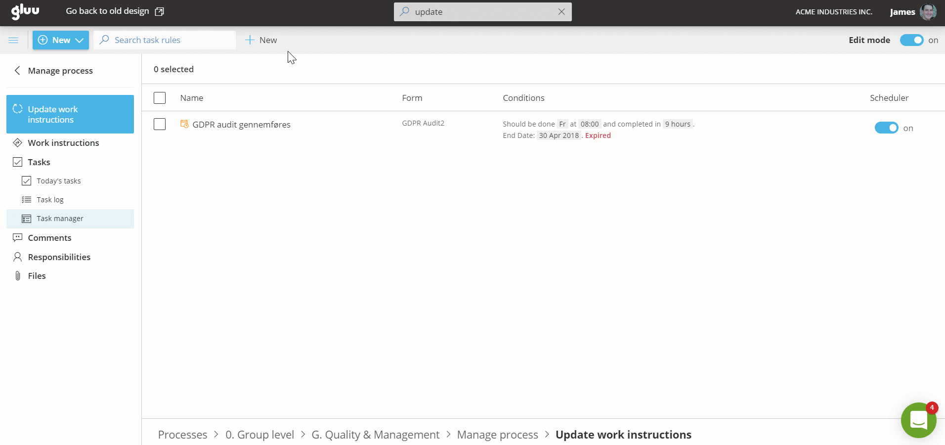 Aufgaben sind die konkretesten, umsetzbarsten Schritte in einem Prozess. Fügen Sie sie zu Aktivitäten hinzu und erledigen Sie sie im Browser oder in mobilen Apps. Verwenden Sie Checklisten, um Konsistenz zu gewährleisten und Fehler zu vermeiden. Gluu hat zwei grundlegende Arten von Aufgaben: