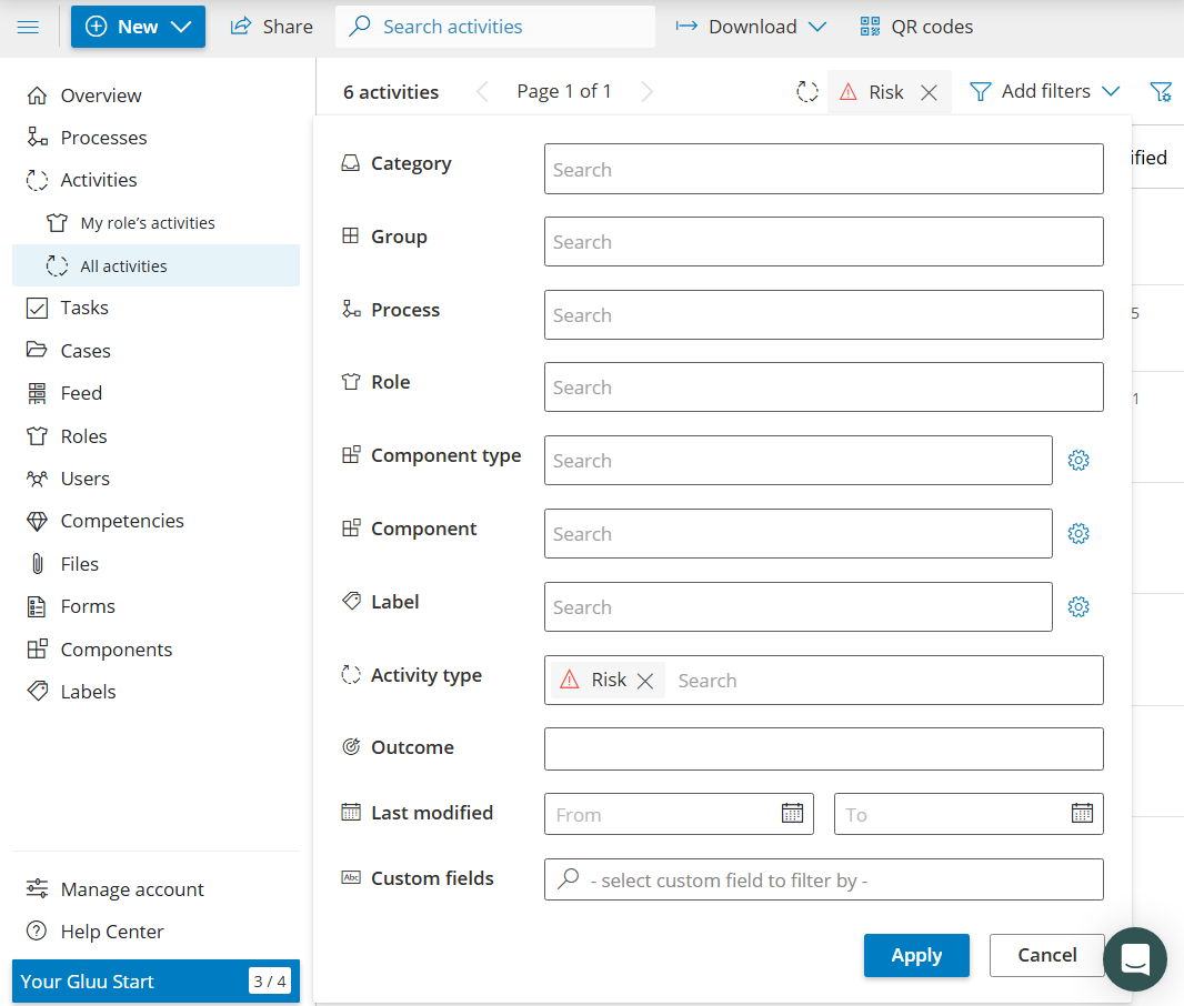 Beispiel: Alle AktivitĂ€ten des Typs âRisikoâ, um risikoreiche Arbeit anzuzeigen. Könnte natĂŒrlich auch als Label erfolgen.