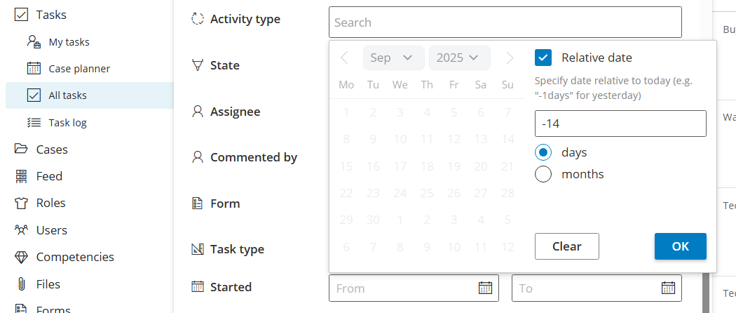 - Gestartet, Abgeschlossen, FĂ€lligkeit der Aufgabe â absolute oder relative Datumsangaben.