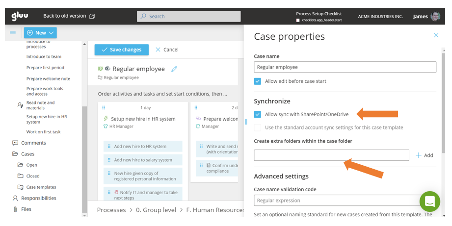 - Template-level standard – override per case template when different sites/folders/naming are required.