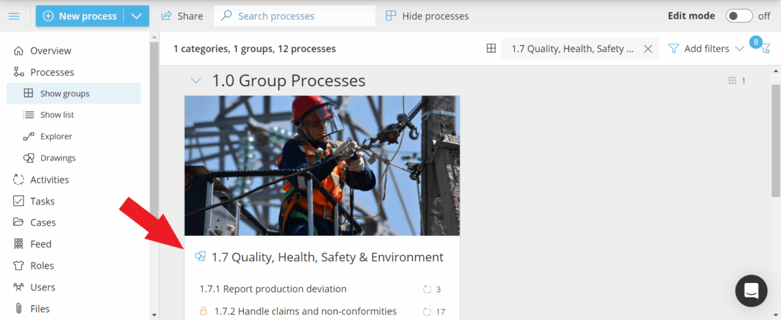 Example: Clicking the drawing link for “1.7 Quality, Health, Safety & Environment” opens the process overview page filtered to that group.