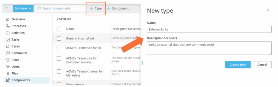 Use types to categorize components (e.g., General internal links, Competency, Vocabulary, Business application, Legal texts, Reference documents, External links, SharePoint sites).